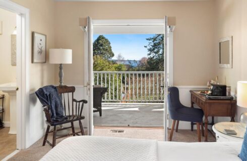 Our Marrowstone Room is a beautifully renovated 2nd-floor accommodation with French doors that open onto the upper veranda with outdoor seating where you can enjoy views of Townsend Bay and Marrowstone Island in the evening light. In the morning, light bathes the room and lightens your mood for the days’ activities. This is the center room on the veranda with a queen-size bed and private bathroom with shower. It has a small desk and chair ideal for working on your laptop. Relax on the veranda in the two comfy wicker chairs and table with outstanding early morning sunrises.